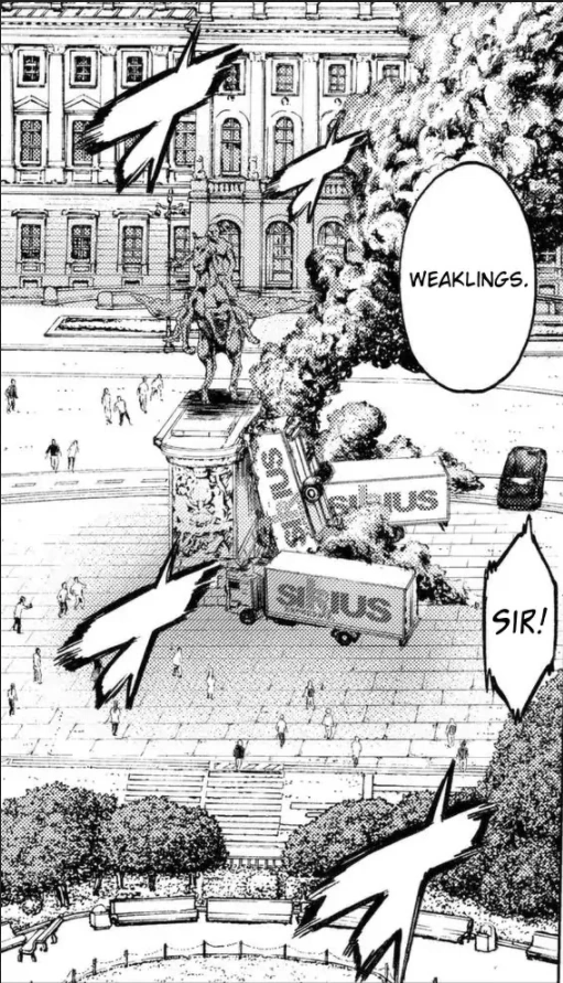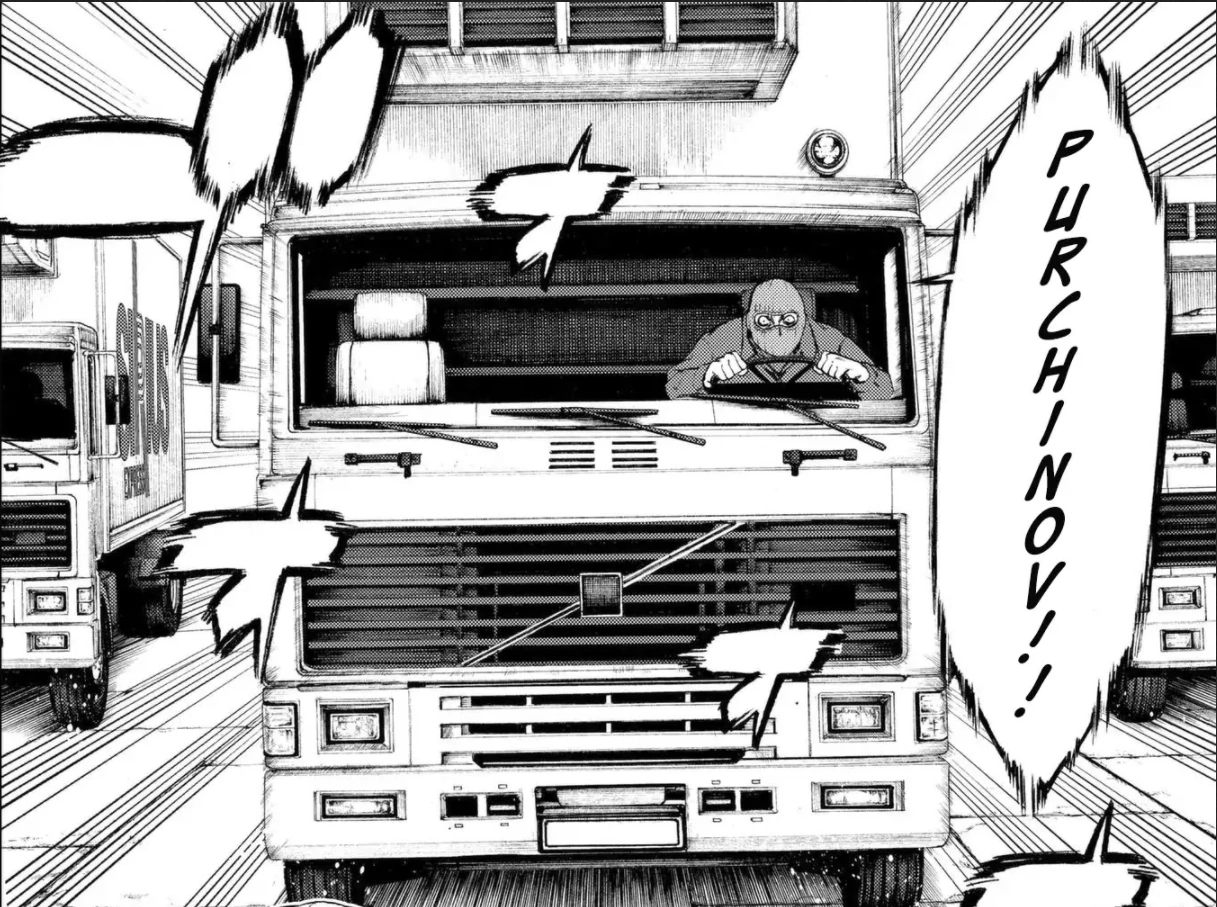 As Purchinov was telling to Arslan to step aside, he already knew the terrorists were influenced by one of the super powers, perhaps the possibility of rival countries willing to destroy Pursia and mentioned how he might regulating trucks this time. Purchinov calmly stood still, two of the trucks rammed on the statue to create a wall with zero spaces, so the president wouldn't be able to escape the third truck incoming toward him. For the first time in the series, the president has shown a display of his tremendous strength by stomping the concrete below him so a piece of solid stone literally stopped the third truck. Due to the impact, the truck was sent flying toward Purchinov, so he grabbed the truck and performed what it seems to be a judo shoulder throw, which the truck landed on the side of the statue.